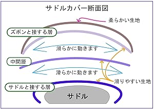 また、外キャップ、内キャップ及び中間層の固定を一部分だけにすることで、それぞれが独立して動くことができ、中間層がズボン側の動きとサドル側の動きを切り離す役割を果たします。